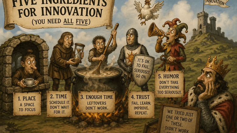 I believe it comes down to five ingredients: place, time, enough time, trust and humor. You need all five. Not one or two. All five working together. Because innovation is not something you get by telling people to be more creative. It happens when you build an environment where ideas are allowed to appear, be tested, fail, improve and eventually become useful.